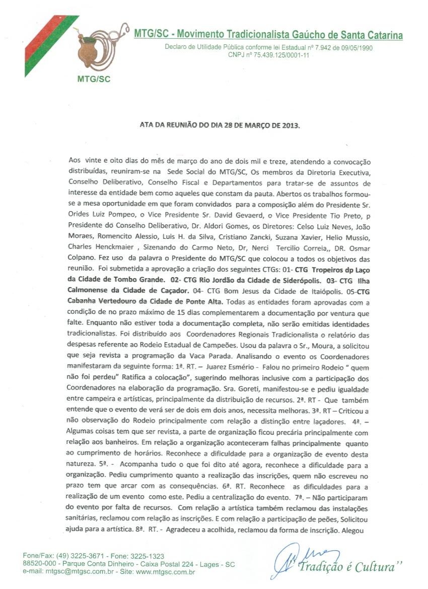 Ata da Reunião Ordinária do Conselho Deliberativo do MTG-SC, realizada em 27 de julho de 2012.